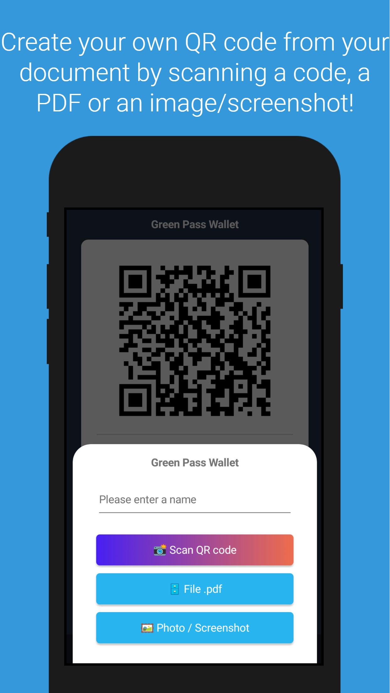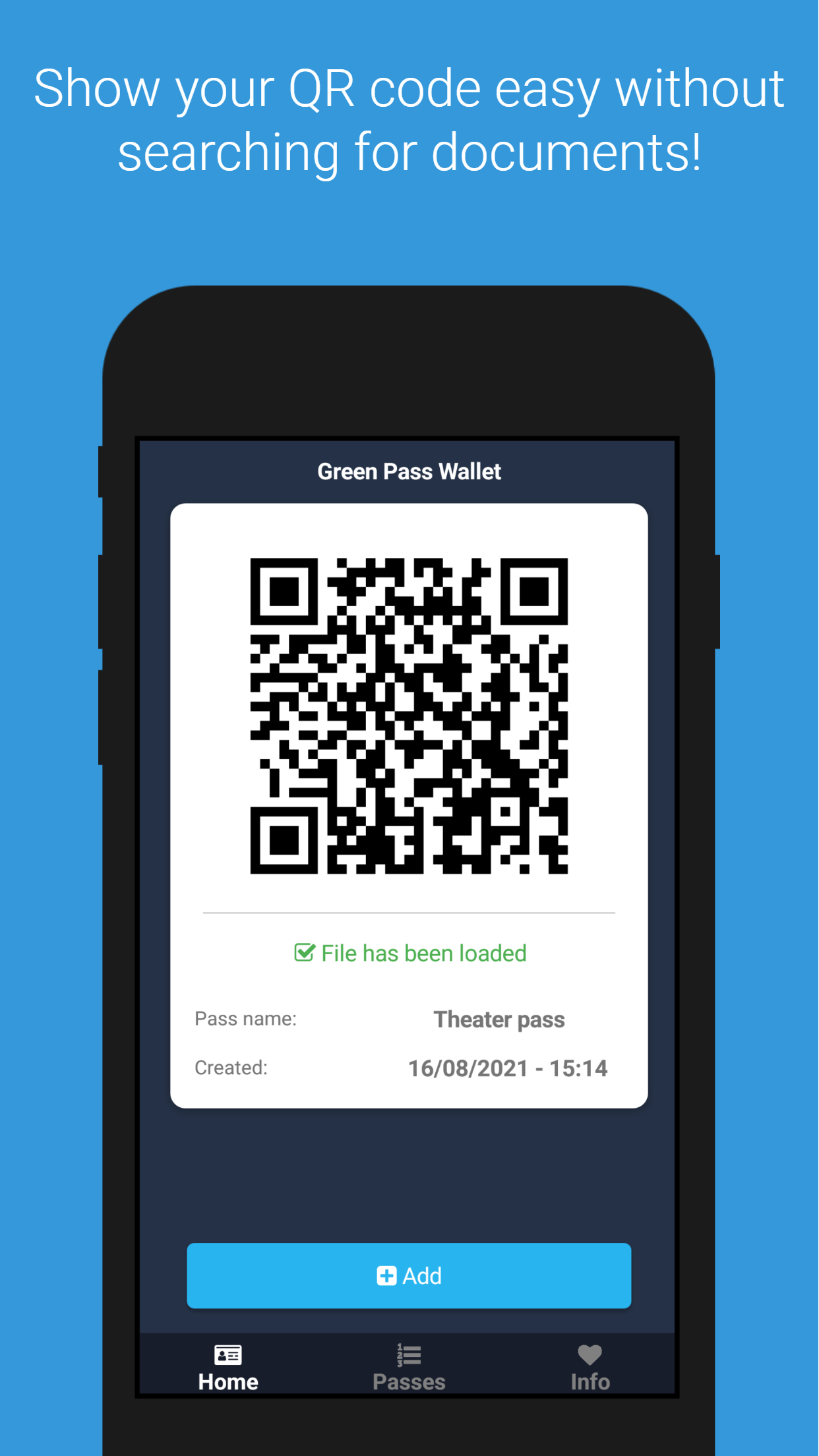 The Green Pass application is the ultimate wallet for easy and fast display of QR codes, pdf files or photos, in places where it is required for our access. The display of the necessary file / code in airports, restaurants, culture, sports and wherever else is required, is now done with just one click. The time consuming search process in the collection of photos, emails and mobile files is now a thing of the past.