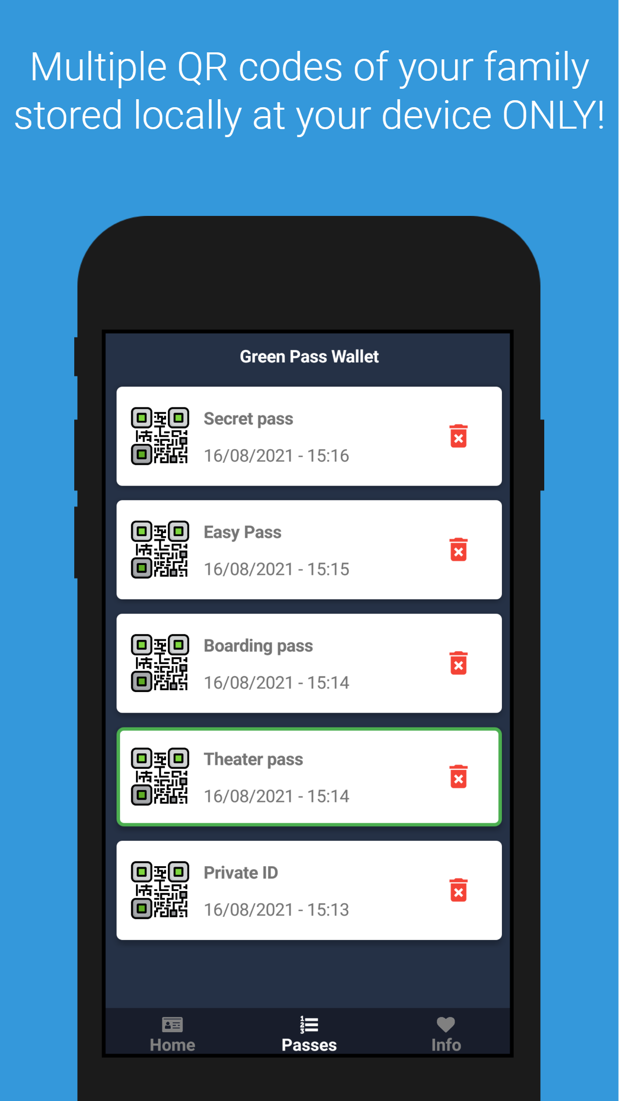 You can have QR Codes of your whole family on your device without carrying documents. All your data remains locally and does NOT sent to third persons.
