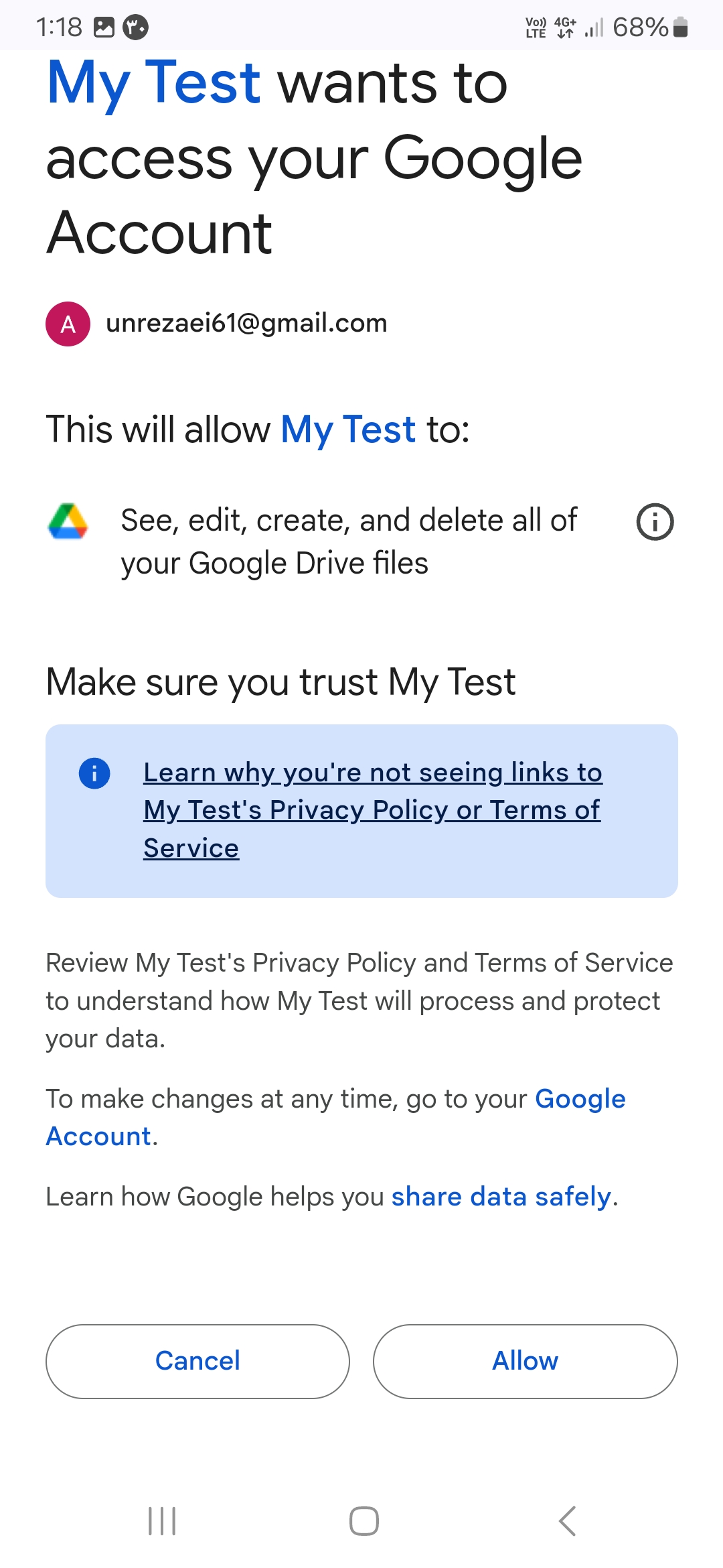 Ensure you have added the necessary permissions (scopes) for Drive