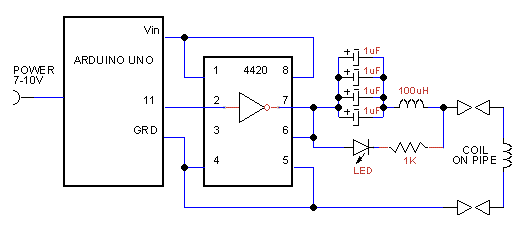 The 100uH coil and 4x 1uF drive the coil on the pipe with a current of about 1A at 10V, this allows high efficiency with less heat and less cost of running.