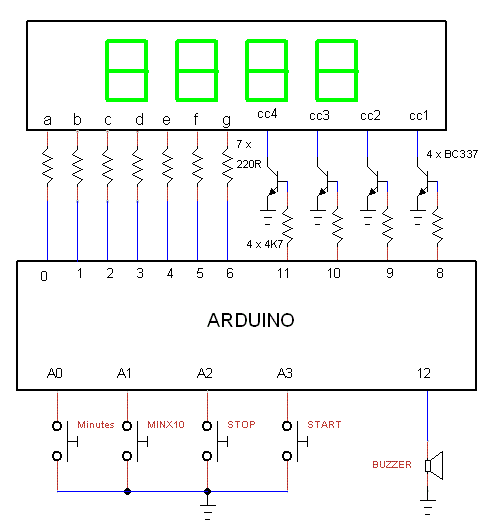 Seven segments LED display, Arduino Uno or Nano egg timer. Seconds displayed, minutes are set by buttons. Also buttons for start and stop, pressing together MIN and MINx10 resets the display. Alarm at the end of count down switches on a 5VDC buzzer or a LED.
