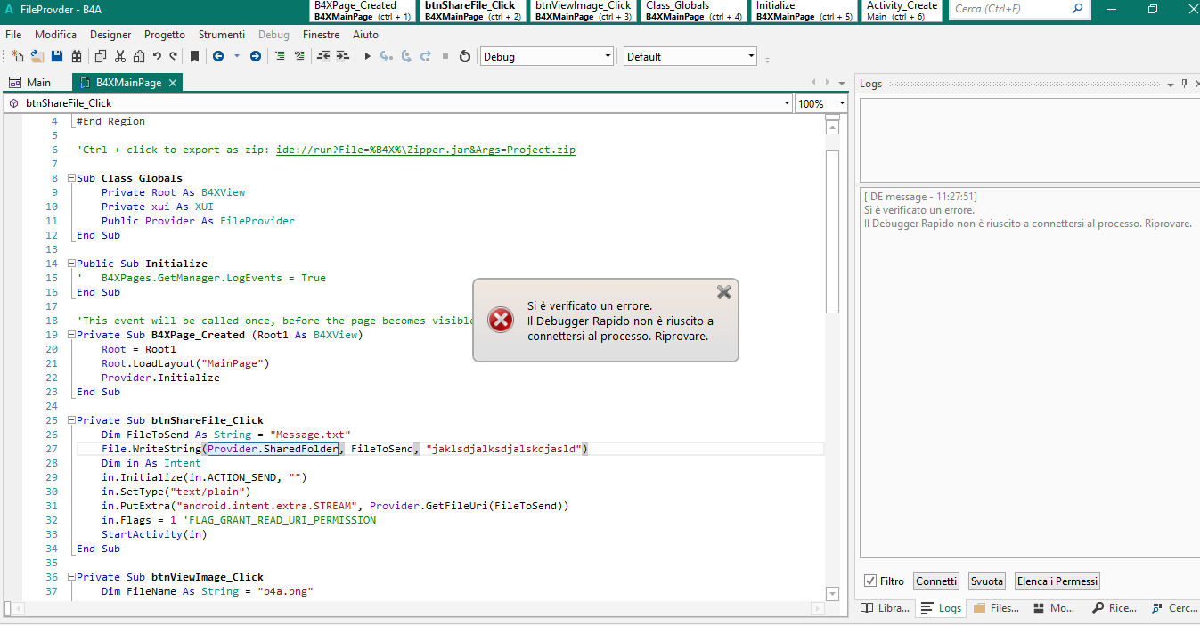 Italian mail class-fileprovider, Il Debugger Rapido non è riuscito a connettersi al processo