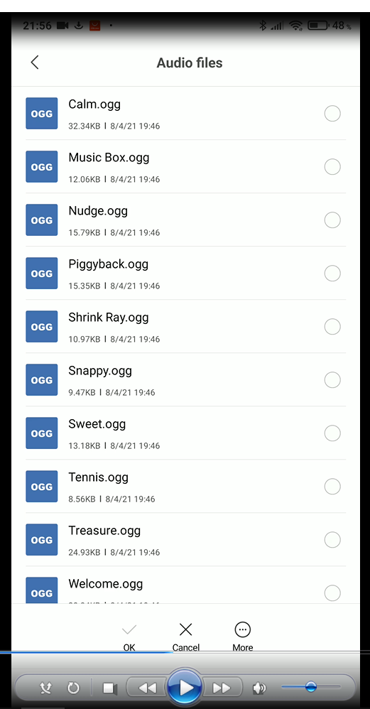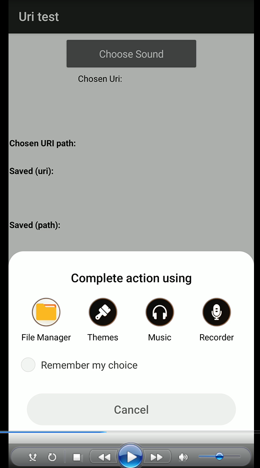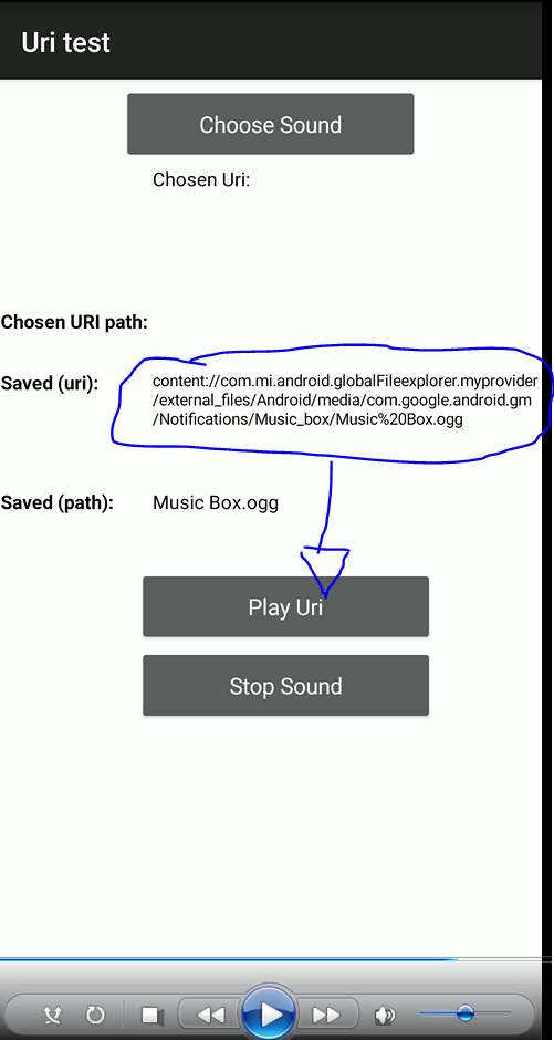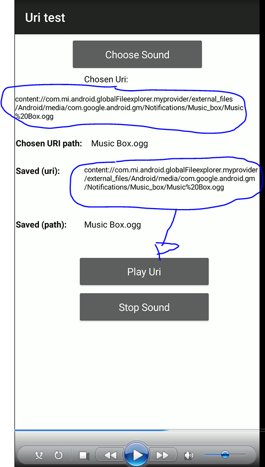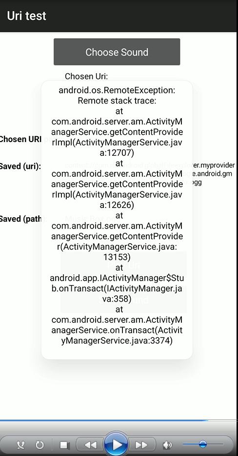 I have an app that let the user to choose a ringtone, save the URI using KVS and then play it back. Actually the app does much more but I have narrowed the issue to this playback strange behavior which I confirmed by creating a super simple app that basically allows the user to select a tone, save as KVS and play it. Upon open, it reads back from KVS and on this Xiaomi it fails to play (images 4 and 5) while if the user plays the tone after selecting it (1,2 and 3) it works. the URI are just the same (the selected and the saved) so I really don't get why it crashes using the saved one. Again, on all other phones I tried, it works just fine.