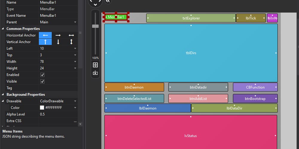 Erel said: The menu is anchored to its parent. Put it inside a pane(l). Click to expand... Ok then I have to see how to fix that. Thanks Erel