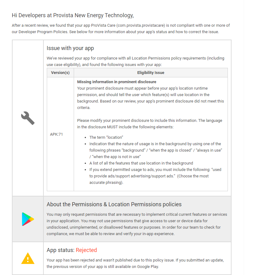 We’ve reviewed your app for compliance with all Location Permissions policy requirements (including use case eligibility), and found the following issues with your app: