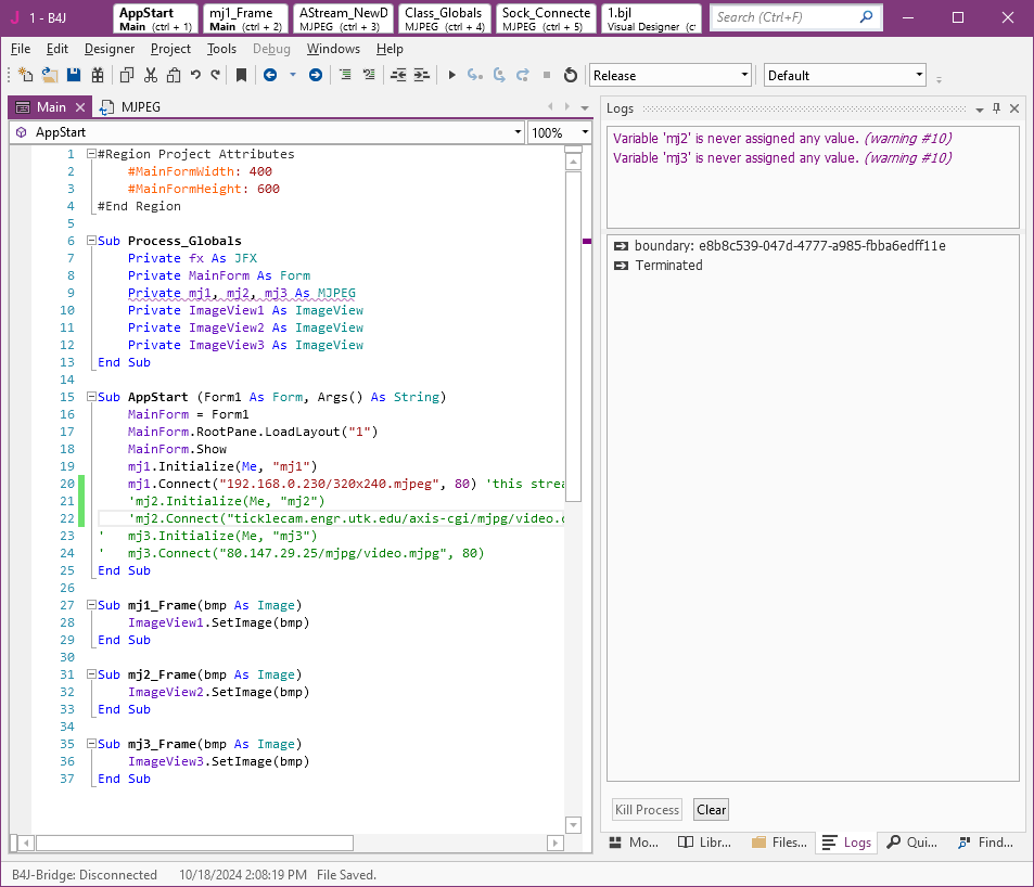 I run the example from here [B4X] [class] MJPEG decoder and can connect to my ESP32 in stream mode and receive one frame, but I don't seem to receive more and then I get a 'Terminated' message.