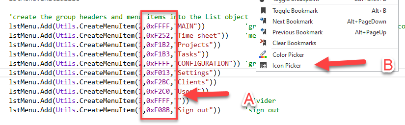 The list of menu options uses the FontAwesome icons with the menu title.