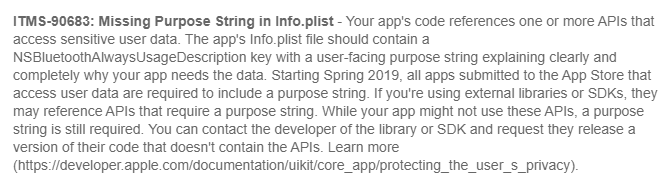 My app DOES NOT use Bluetooth at all. Here are libs that i use:ITMS-90683: Missing Purpose String in Info.plist - Your app's code references one or more APIs that access sensitive user data. The app's Info.plist file should contain a NSBluetoothAlwaysUsageDescription key with a user-facing purpose string explaining clearly and completely why your app needs the data. Starting Spring 2019, all apps submitted to the App Store that access user data are required to include a purpose string. If you're using external libraries or SDKs, they may reference APIs that require a purpose string. While your app might not use these APIs, a purpose string is still required. You can contact the developer of the library or SDK and request they release a version of their code that doesn't contain the APIs. Learn more (https://developer.apple.com/documentation/uikit/core_app/protecting_the_user_s_privacy).