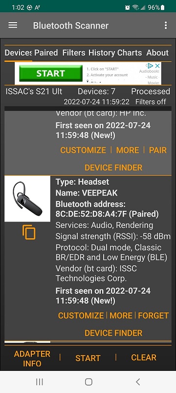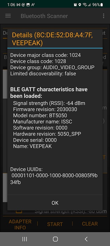 I have used several Bluetoth well known Apps, and they can all connect to the device without any problem. With my App I am able to connect to other BLE devices.