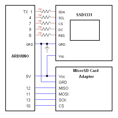 1K resistors are to reduce 5V outputs of Arduino to 3.3V Oled input.