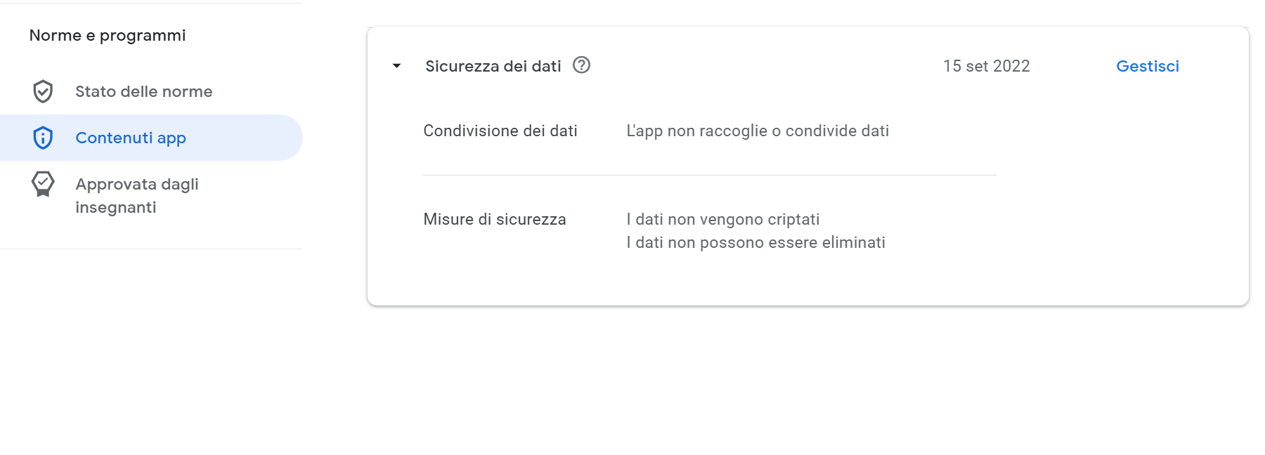 Unica voce presente già attiva riguarda indicazione che app non raccoglie dati.