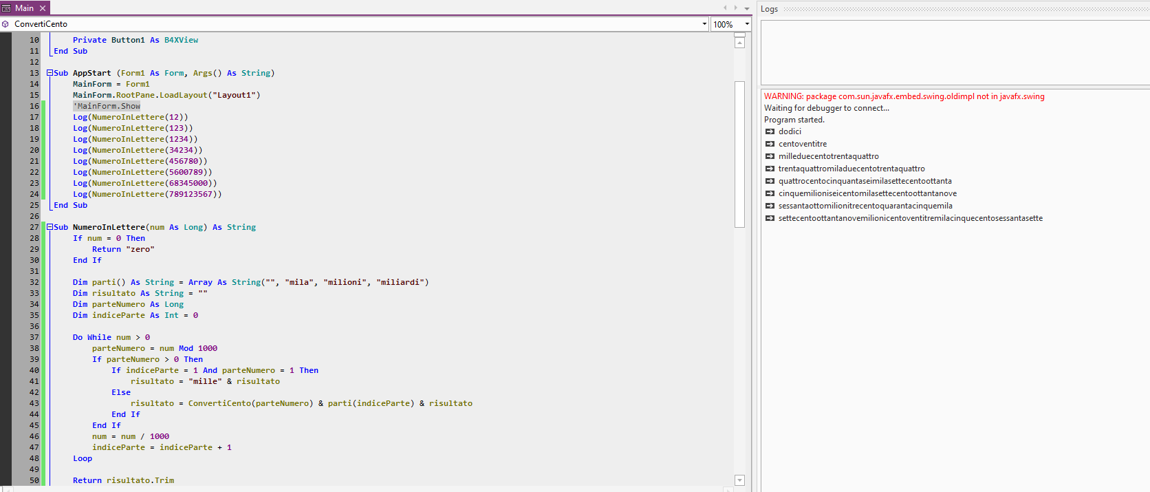 B4X:Sub AppStart (Form1 As Form, Args() As String) MainForm = Form1 MainForm.RootPane.LoadLayout("Layout1") 'MainForm.Show Log(NumeroInLettere(12)) Log(NumeroInLettere(123)) Log(NumeroInLettere(1234)) Log(NumeroInLettere(34234)) Log(NumeroInLettere(456780)) Log(NumeroInLettere(5600789)) Log(NumeroInLettere(68345000)) Log(NumeroInLettere(789123567)) End Sub Sub NumeroInLettere(num As Long) As String If num = 0 Then Return "zero" End If Dim parti() As String = Array As String("", "mila", "milioni", "miliardi") Dim risultato As String = "" Dim parteNumero As Long Dim indiceParte As Int = 0 Do While num > 0 parteNumero = num Mod 1000 If parteNumero > 0 Then If indiceParte = 1 And parteNumero = 1 Then risultato = "mille" & risultato Else risultato = ConvertiCento(parteNumero) & parti(indiceParte) & risultato End If End If num = num / 1000 indiceParte = indiceParte + 1 Loop Return risultato.Trim End Sub Sub ConvertiCento(num As Int) As String Dim unita() As String = Array As String("", "uno", "due", "tre", "quattro", "cinque", "sei", "sette", "otto", "nove") Dim speciali() As String = Array As String("dieci", "undici", "dodici", "tredici", "quattordici", "quindici", "sedici", "diciassette", "diciotto", "diciannove") Dim decine() As String = Array As String("", "", "venti", "trenta", "quaranta", "cinquanta", "sessanta", "settanta", "ottanta", "novanta") Dim centinaia() As String = Array As String("", "cento", "duecento", "trecento", "quattrocento", "cinquecento", "seicento", "settecento", "ottocento", "novecento") Dim nUnita As Int = num Mod 10 Dim nDecine As Int = (num / 10) Mod 10 Dim nCentinaia As Int = num / 100 Dim risultato As String = "" risultato = centinaia(nCentinaia) If nDecine = 1 Then ' Numeri tra 10 e 19 risultato = risultato & speciali(nUnita) Else risultato = risultato & decine(nDecine) If nUnita > 0 Then risultato = risultato & unita(nUnita) End If End If Return risultato End Sub
