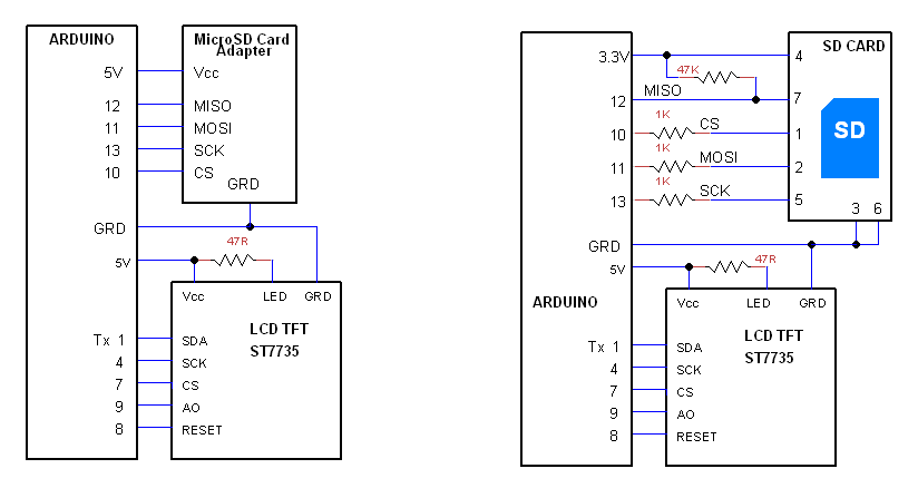 The circuit diagram shows an option of using Micro SD module and an option of using the SD card on the back of the TFT module. The 1K resistors are on the TFT module, If you don't have them on your module you have to add them to avoid high currents to the SD inputs.