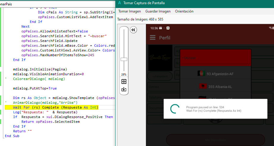 opPaises.CustomListView1.AddTextItem( cs.Initialize.Image(LoadBitmap(File.DirAssets,cPais.ToLowerCase & ".png"),32dip,24dip,False).Append(" " & Paises.Get(cPais)& " " & Nombre).PopAll,cPais)