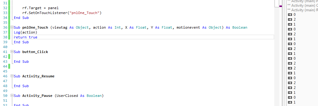Sub pnlOne_Touch (viewtag As Object, action As Int, X As Float, Y As Float, motionevent As Object) As Boolean