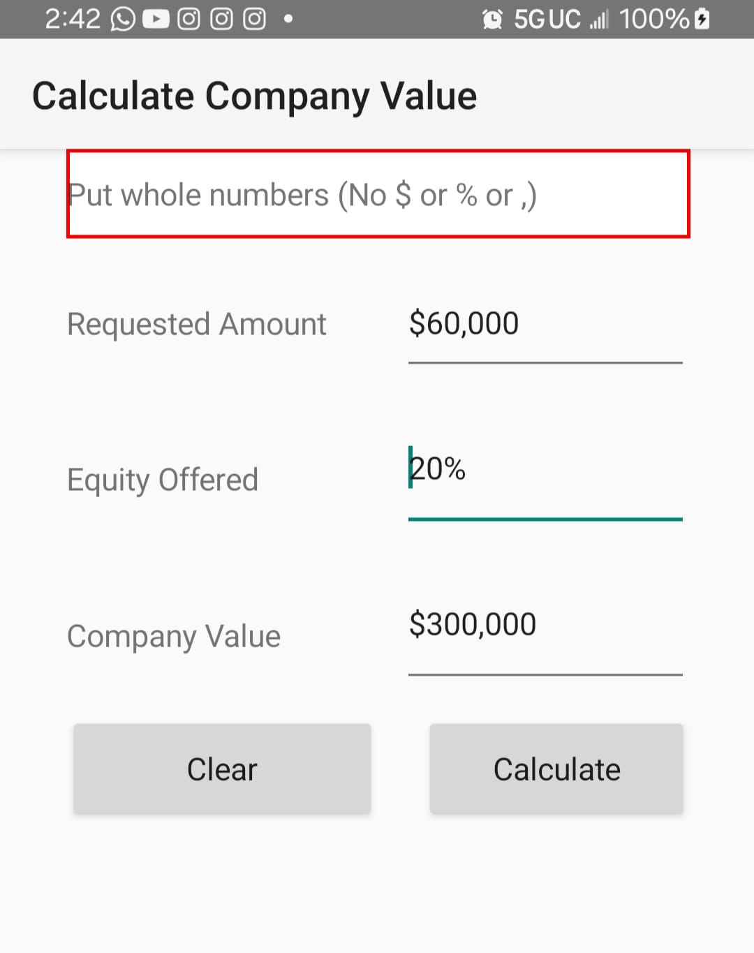 valuation = amountRequested / equityPercentage