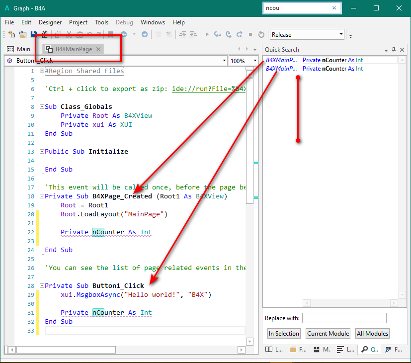 When we search for a text, it is listed in 'quick search' window. It would help if the 'sub' name is shown, even in tool-tip. A column separator line to increase left column width manually. (the code is for demonstration only) Regards, Anand