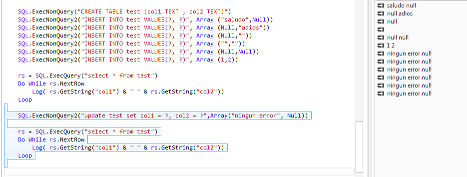 Ejemplo 1 SQL.ExecNonQuery("UPDATE Texto SET Linea1 = "&s.Linea1&",Servicio = "&s.linea2&)