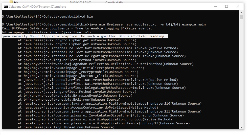 No, ho esattamente fatto quello che mi dici, creo la BUILD , ma quando avvio il programma dentro la build , si avvia ok però quando cllicco sul pulsante [Clicl] del programma, esso si chiude inaspettatamente con l'errore in figura, mentre in debug o in release da dentro B4J tutto funziona. Puoi provarlo anche Tu se vuoi con l'esempio allegato.
