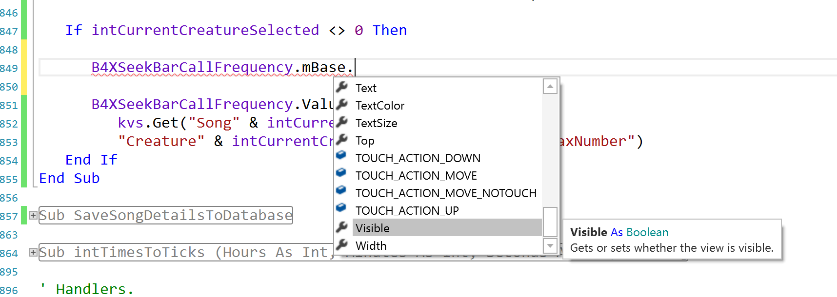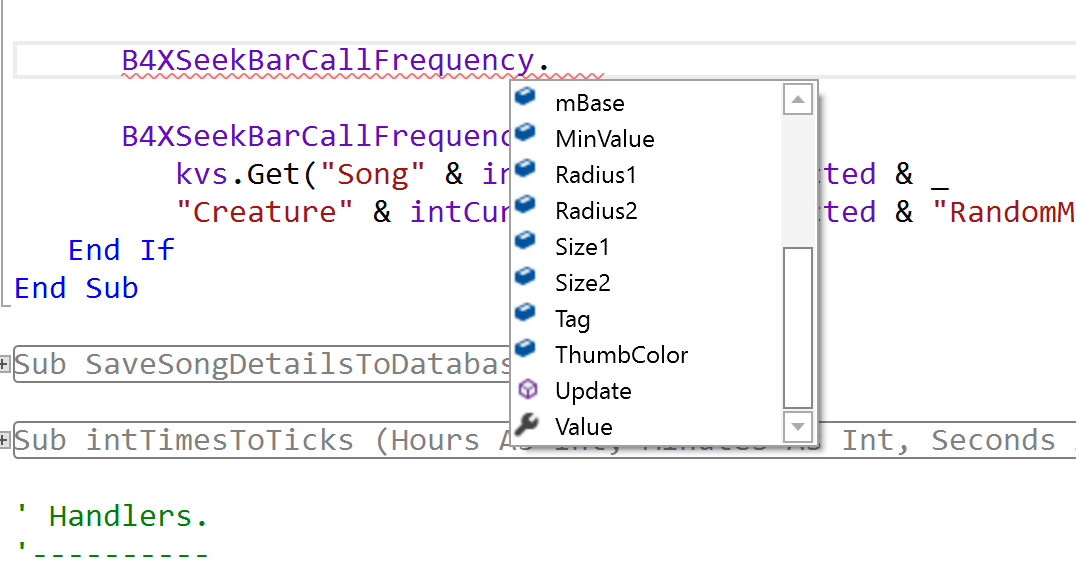 Can you tell me how to change the visible or enabled property of the B4XSeekBar? I couldn't find those properties in the auto-complete.