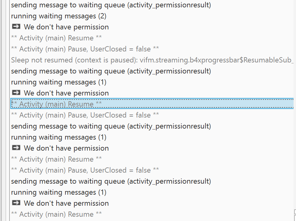 I expected a dialog screen to appear asking for the permission since the permission was not set yet. Also the Log displayed is from Result = False. Instead of the screen asking for the permission the Log statement keeps repeating as if it's in a loop.