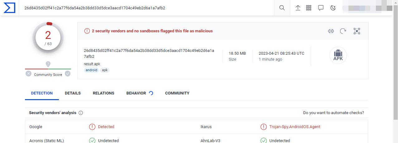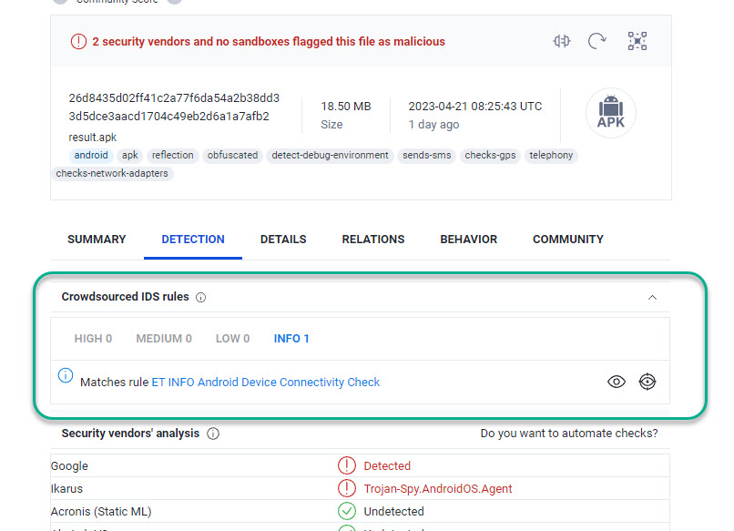 Icarus classifies it as "Trojan-Spy.AndroidOS.Agent"
