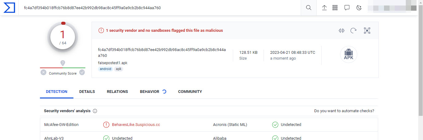 A new neutral default app (see "falsepostest1.zip") was scanned with the following result: