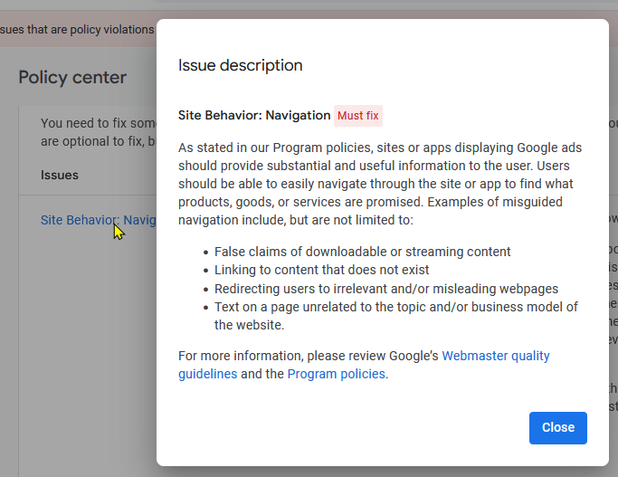 As stated in our Program policies, sites or apps displaying Google ads should provide substantial and useful information to the user. Users should be able to easily navigate through the site or app to find what products, goods, or services are promised. Examples of misguided navigation include, but are not limited to: