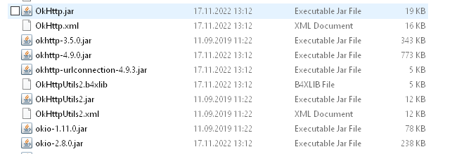 I'm using the same additional library folder as before which didn't complain. Here's a snapshot of libraries folder which includes okio. If I remove any of the okio jar files, compiler complains about not finding them.