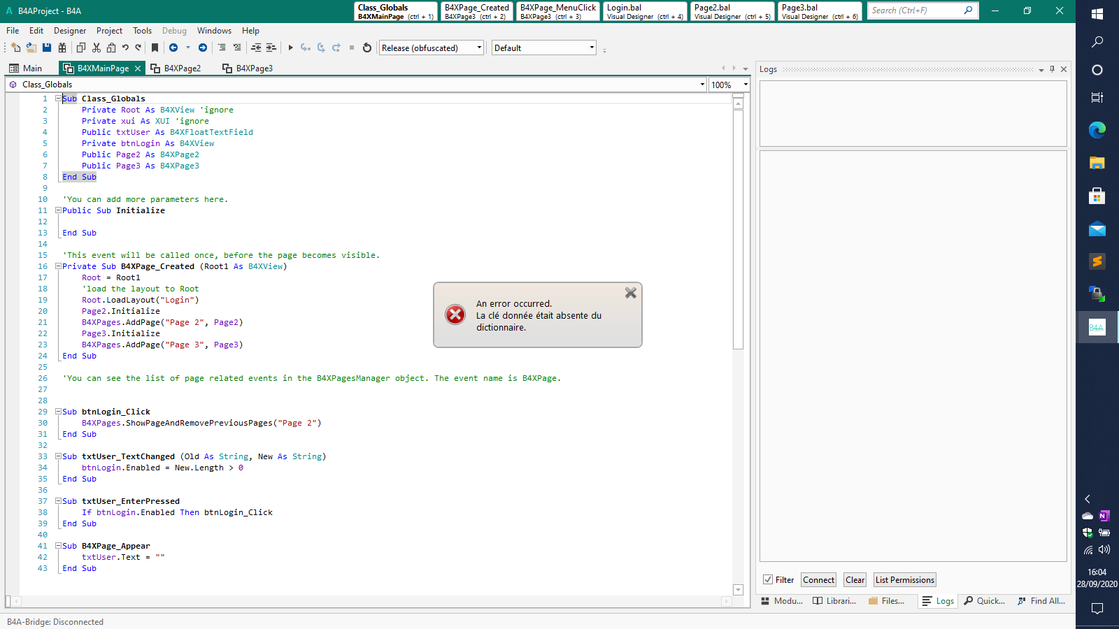 B4A 10.2, OpenJDK, Windows 10 Pro French, when opening a sample project (the one related to the B4XPages, three pages and a canvas where we draw random colors), I got the error : the given key was not present in the dictionary. Attached a screenshot.