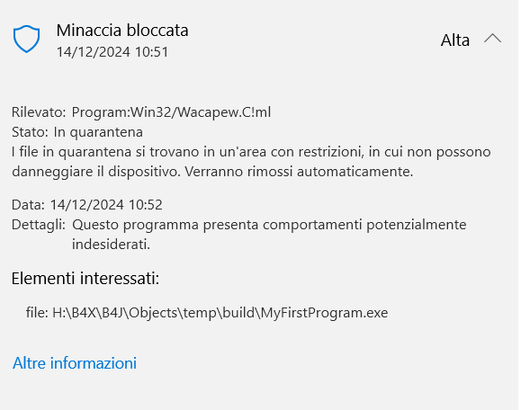 There is another problem. After generating the .exe file, the antivirus microsoft defender quarantines it and then removes it, detecting wacapw.clml ??!!