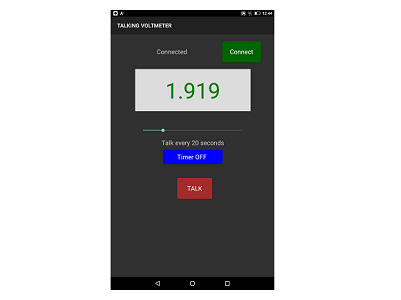 The talking voltmeter has an adjustable timer to set the talk intervals (5 to 105 sec) and a stop button.