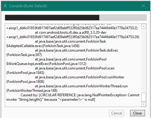 Suppressed: java.lang.RuntimeException: java.util.concurrent.ExecutionException: com.android.tools.r8.internal.xj: java.lang.NullPointerException: Cannot invoke "String.length()" because "<parameter1>" is null