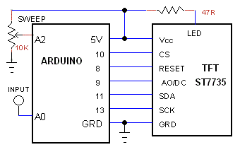 TFT low frequency oscilloscope, bandwidth is DC to 2000Hz. Max sampling rate is 40000 samples per second. An oscilloscope with these specifications has limited use, but it is a good exercise in using LCD TFT. Arduino can be Uno or Nano.