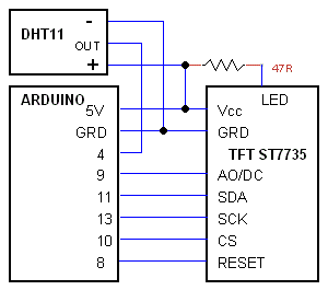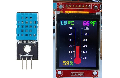 TFT display of digital temperature and humidity. Sensor DHT11 , TFT module is a 1.8" 128 X160 pixel and has the driver ST7735 is driven by SPI (C code).