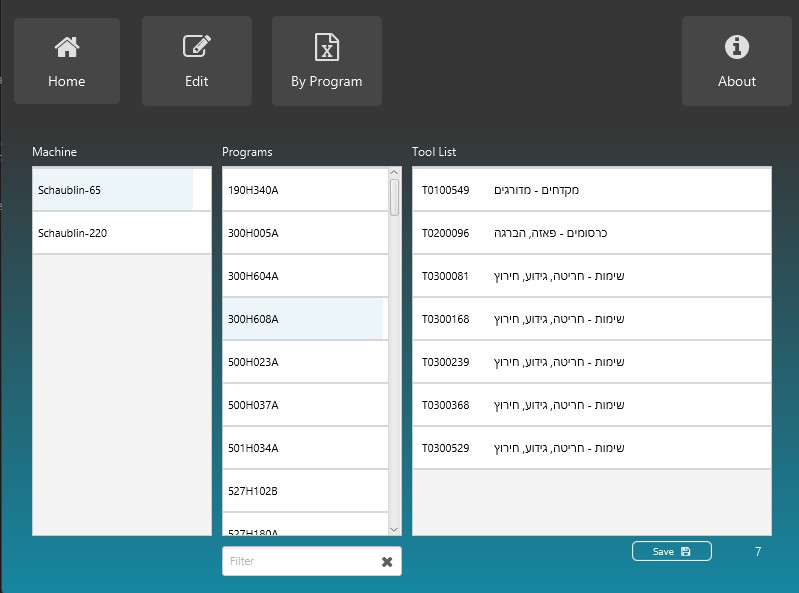 what does the app do? you have all machines names already in the app all you need to do is choose the correct folder where all programs (g-codes) are stored for that machine. b4j will look for all files and start filtering only the tools from those files using regex.match() then create a tool list for each job. then you load an excel file that contains all planned parts for the next few weeks b4j will compare the parts with the tool list and create an excel file that will contain all tools that are needed for those parts. everything is stored in sqlite and is done automatically and i can keep drinking