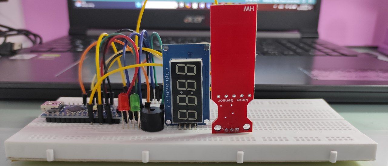 This project measures water level with water sensor module and displays it on seven-segment display. If the water level is less than 600 the green light will turn on , otherwise the red light will turn on and the buzzer will sound.