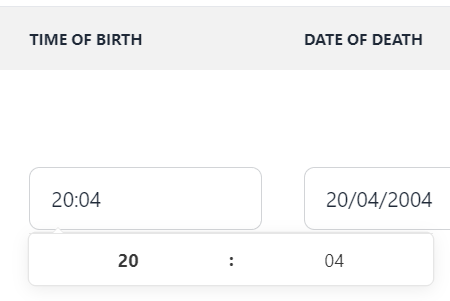 tb4.AddColumnTimePicker("tob", "Time of Birth", False, "H:i", True)