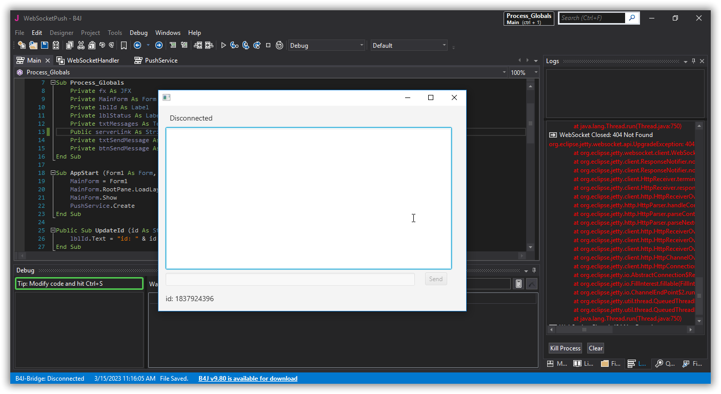 when I run it like the picture above, the status on the form is not connected and the log shows 404