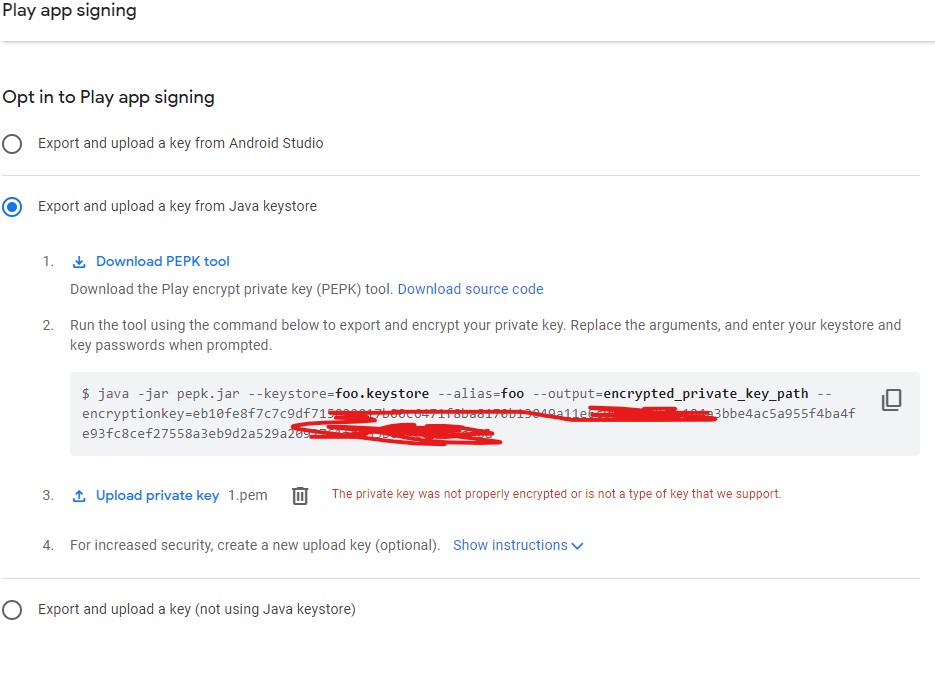 at com.google.wireless.android.vending.developer.signing.tools.extern.export.ExportEncryptedPrivateKeyTool.main(ExportEncryptedPrivateKeyTool.java:130)