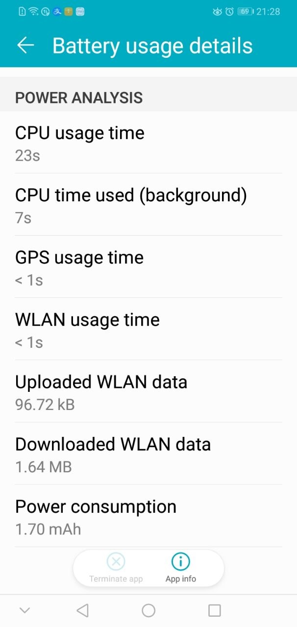 On Honor BKK-AL10 android 8.1.0, when the app is switched to the background or manually close or removed from the recent list, it is detected in the battery interface that the power consumption basically does not increase. power consumption datashow in pic001 pic002, It consumption about 0.6mAh in 30 min.
