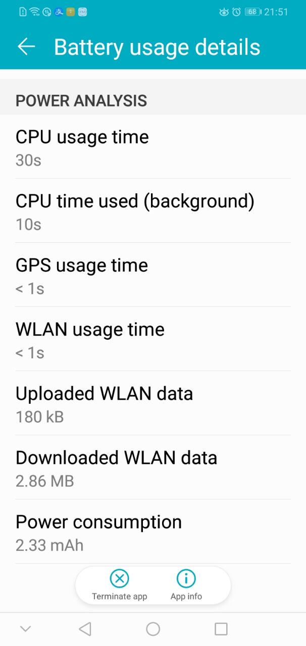 On Redmi 9A android 10, when the app is switched to the background or manually close or removed from the recent list, it is detected in the battery interface that the power consumption is still increased. It consumption about 80mAh in an hour when the app in background or manually close or removed from the recent list. power consumption data --- pic 003