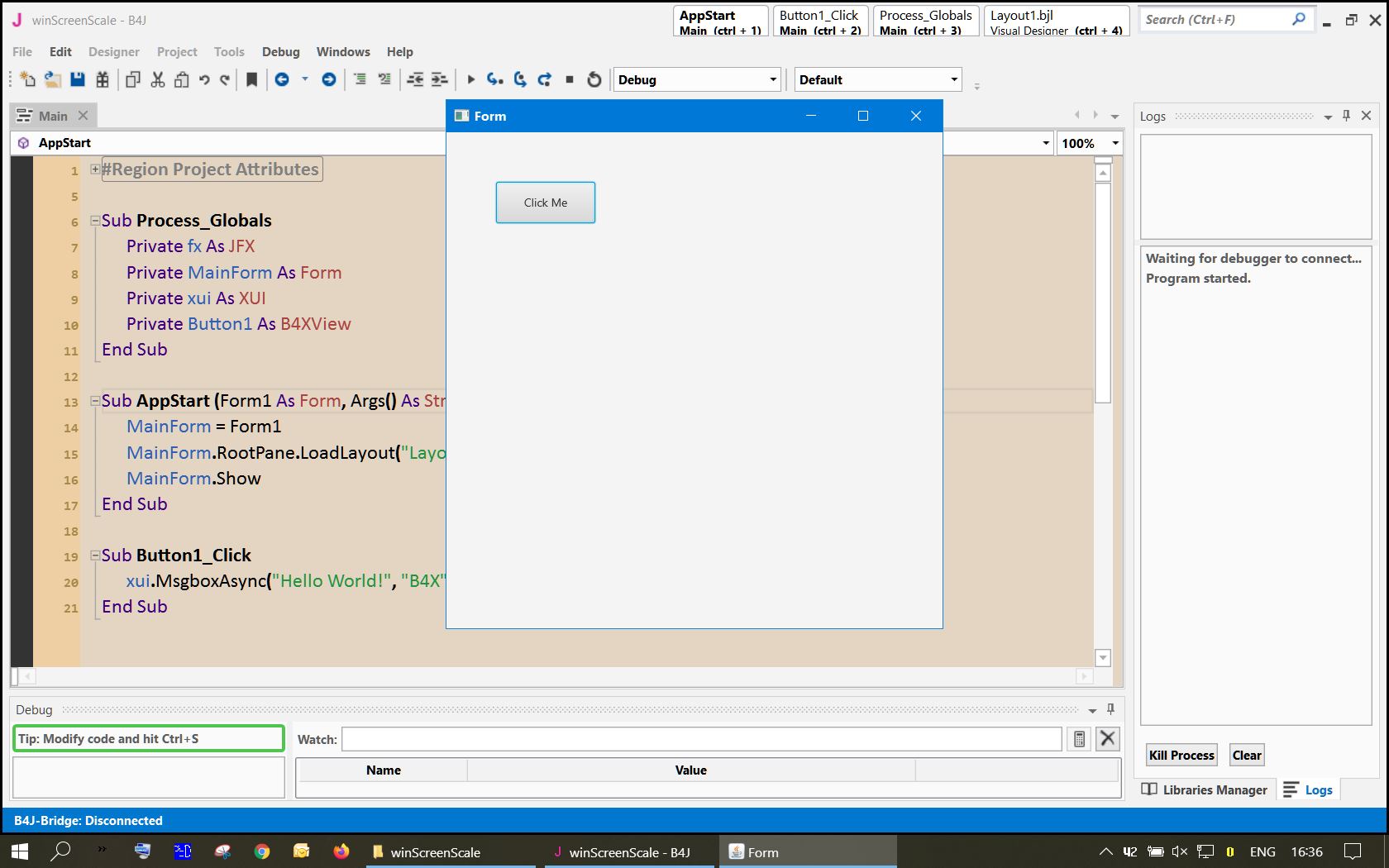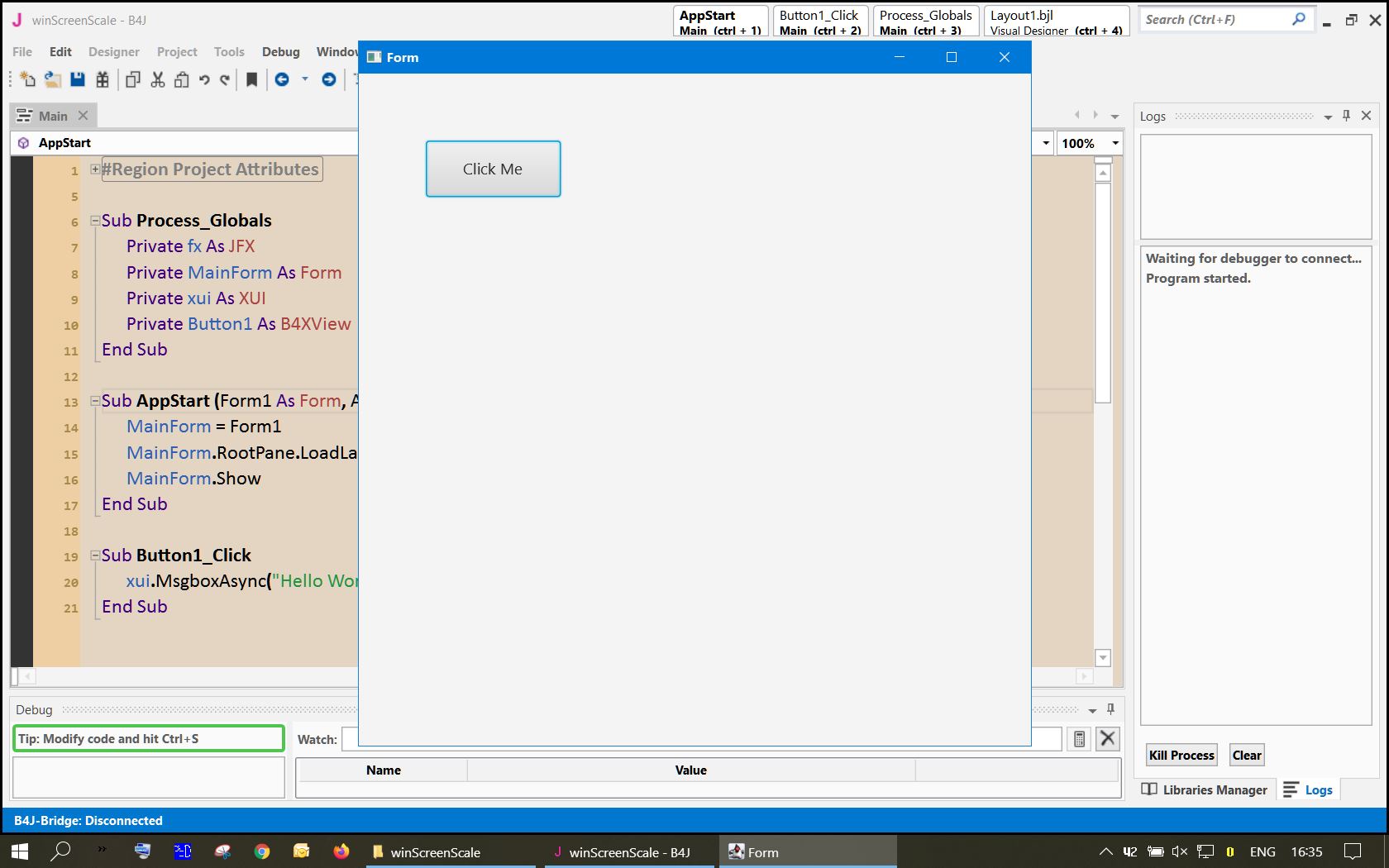 i'm running b4j ide latest version on windows 10 64bit with screen scale factor set to 135%.