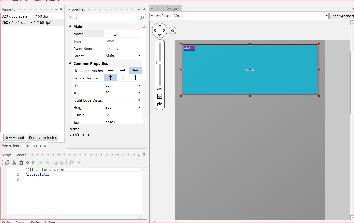 The 'cards' are designed in the Designer, and anchored left/right and top (see attached), this is the code I`m using to display the cards: