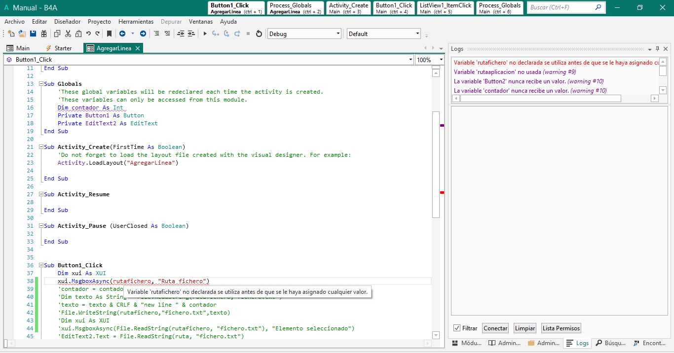 En la actividad: "AgregarLinea" en la linea 38 utilizas una variable "local" llamada "rutafichero".