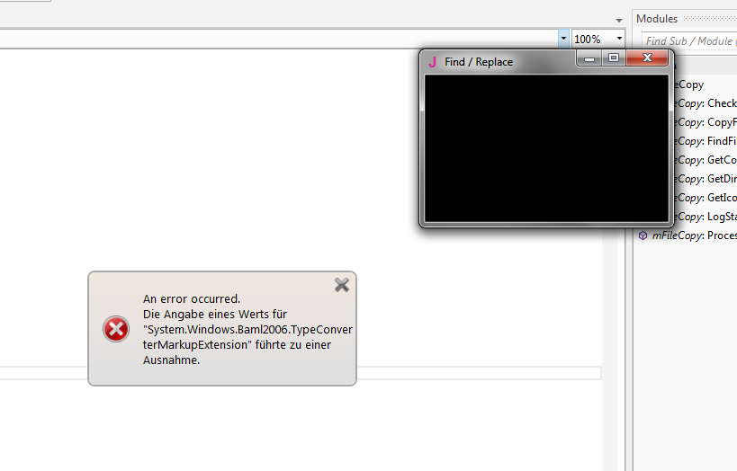If I try to open the Find/Replace dialog an exception is raised. Every second time a very small and empty Find/Replace dialog opens and if I try to enlarge the window, the exception is raised again.