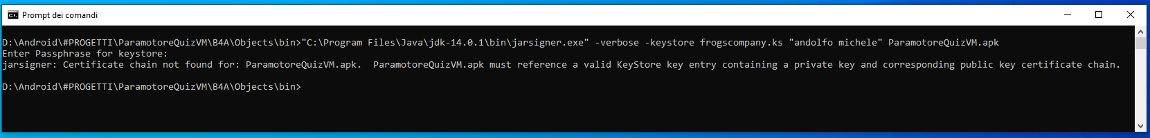 (java -jar pepk.jar --keystore=frogscompany.keystore --alias=b4a --output=D:\Android\prove_ottobre_20023\output_private_key.pem --rsa-aes-encryption --encryption-key-path=D:\Android\prove_ottobre_20023\encryption_public_key.pem)