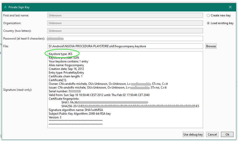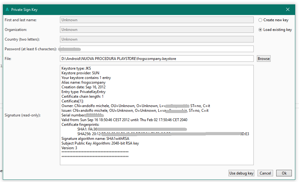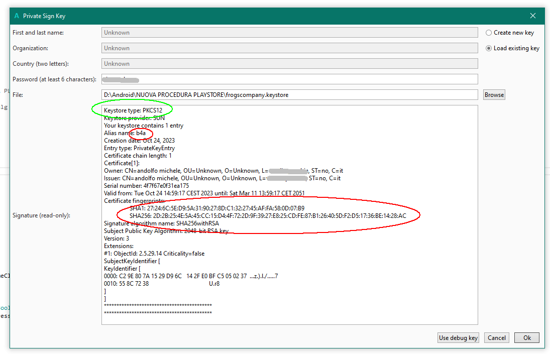A luglio del 2022 avevo fatto una chiave secondo le indicazioni di EREL usando KEYTOOL.exe e