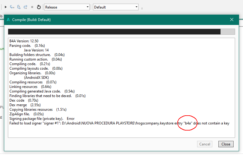 in B4A v.12.5, nella finestra Private Sign Key dopo aver selezionato Load existing key e fornito password, chiave (.keystore), cliccato Ok