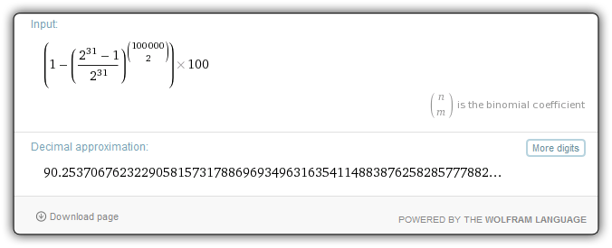 2,147,483,647 / 2,147,483,648 chance = 0.9999999995343